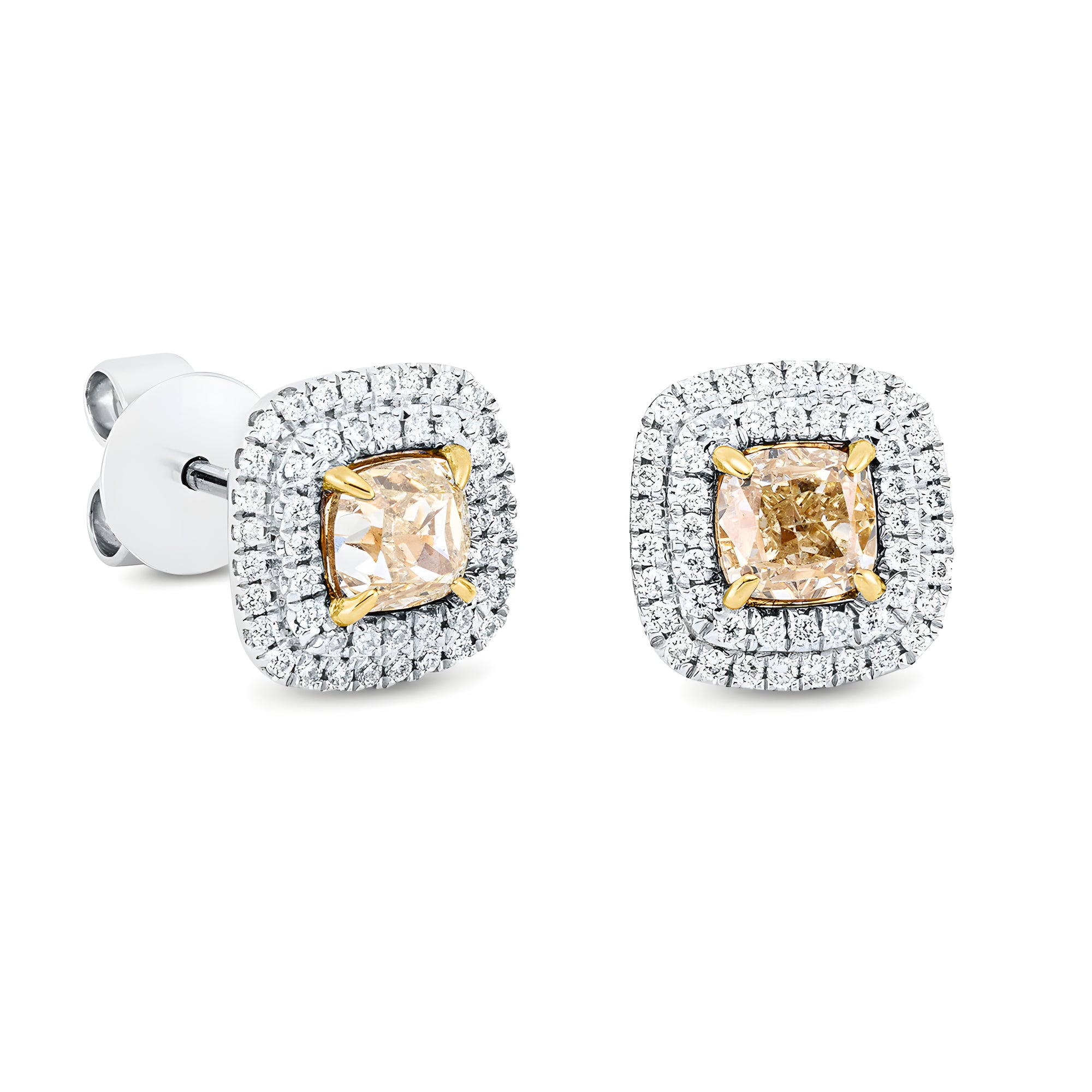Montura din aur alb și galben de 18K lucrată cu măiestrie creează scena pentru ca cele 96 diamante naturale albe de 0.24 carate din standardul de calitate TW-SI, să pună în valoare delicatețea și raritatea celor două diamante galbene cushion de 0.99 carate.