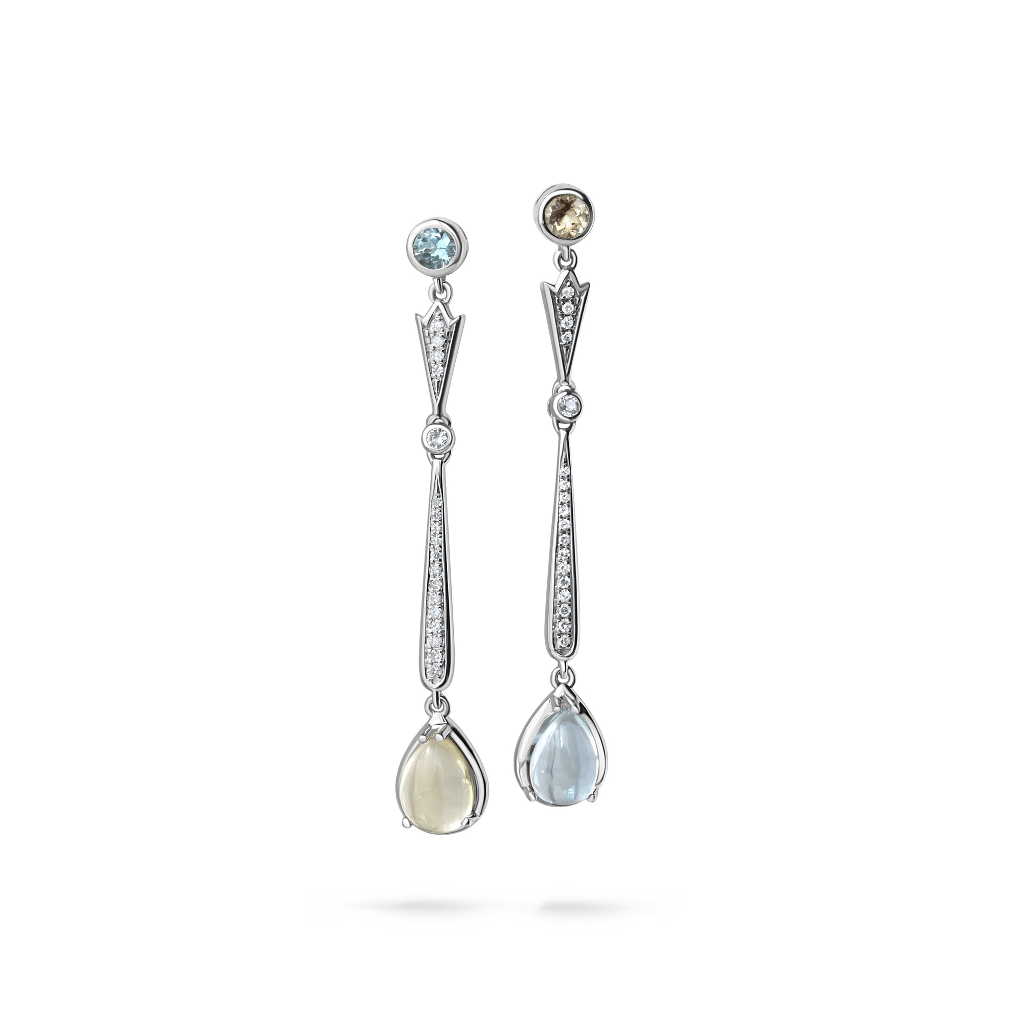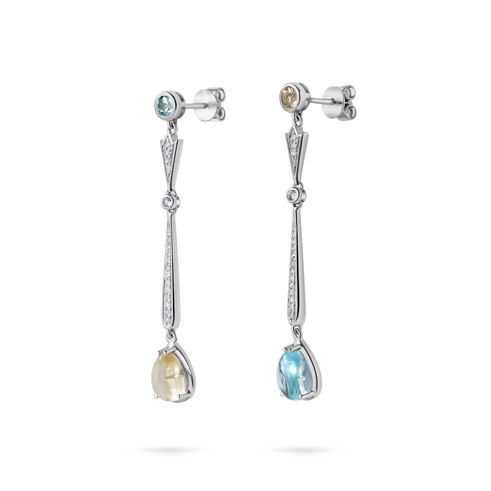 Pietrele prețioase, 1 Blue Topaz Sky Blue de 1.1 carate, 1 Blue Topaz Swiss Blue de 0.15 carate, două pietre de Cuarț Lemon de 0.97 carate, două pietre de Topaz alb de 0.04 carate, 34 de diamante naturale de 0.09 carate, sunt alese cu atenție pentru femeia cu o viziune sofisticată asupra stilului, inspirată din eleganța Art Deco, dar ancorată în modernitate.