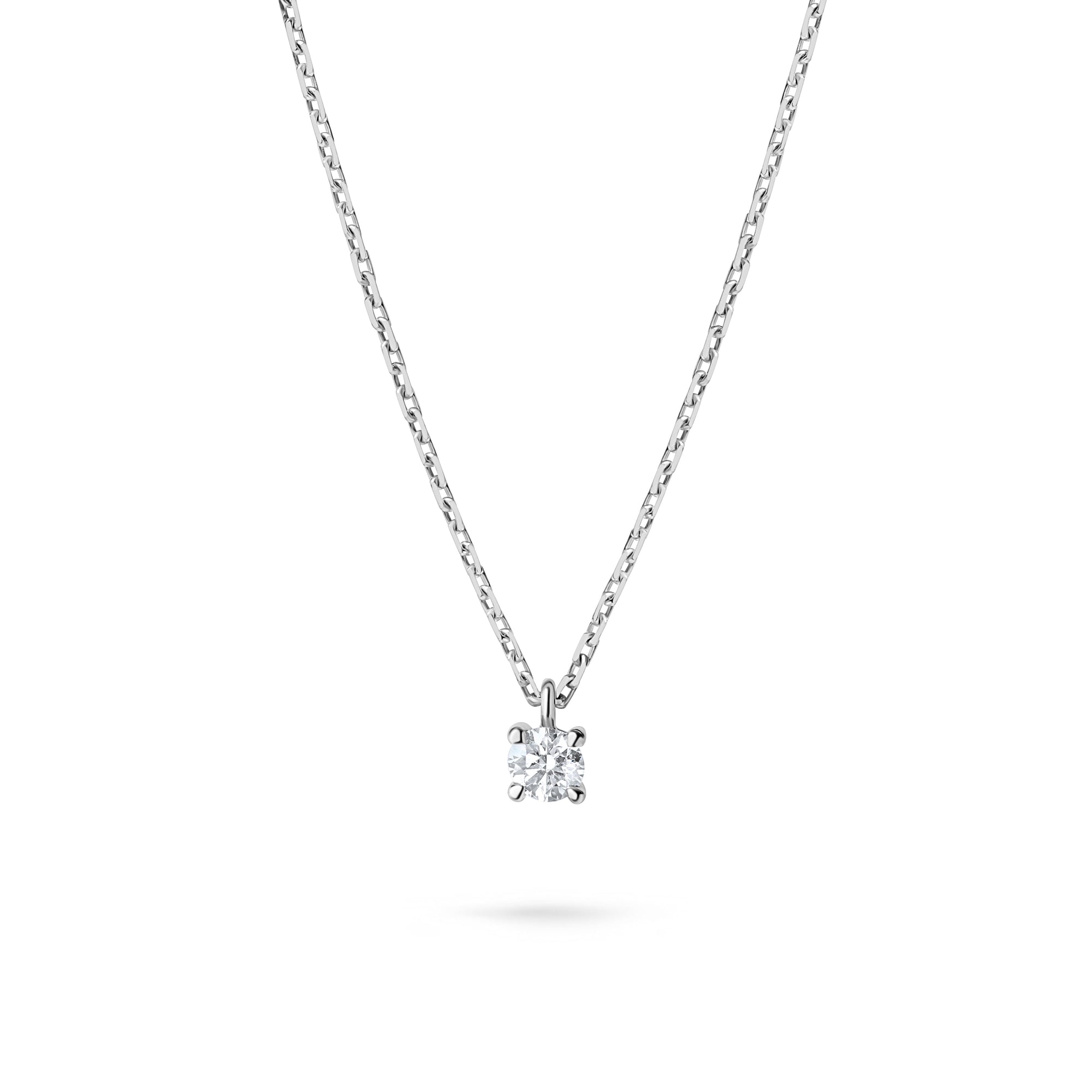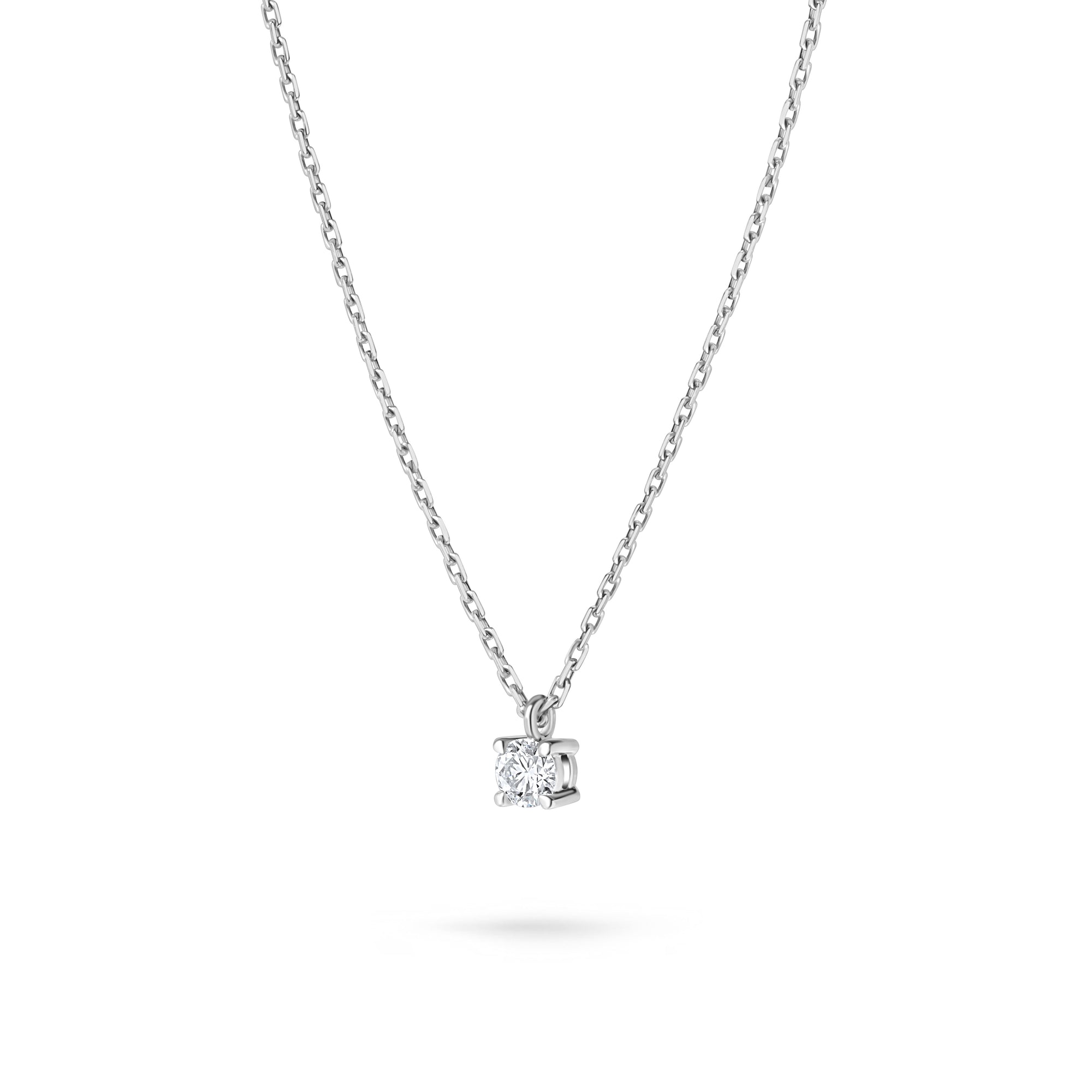 Colierul Solitaire Signature este lucrat în aur alb de 18K, cu un diamant solitaire Signature Crafted Labgrown de 0.1 carate, culoare D-E, claritate VVS-VS, tăietură Excellent cut, lungime ajustabilă 40/45 cm, cu tag personalizat cu diamant de 0.003 carate.