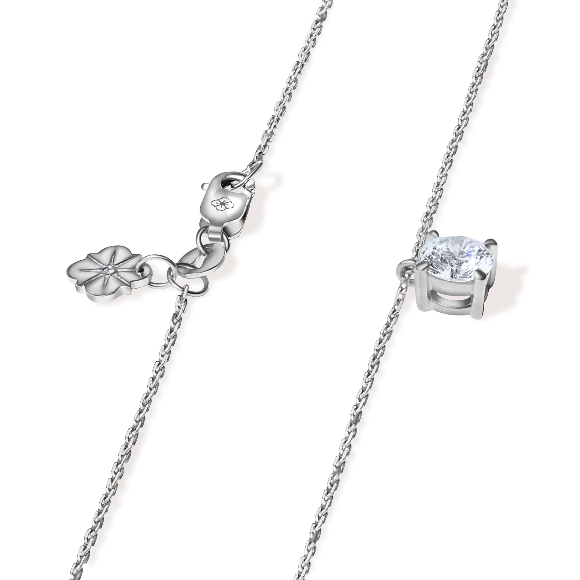 Colierul Solitaire Signature este lucrat în aur alb de 18K, cu un diamant solitaire Signature Crafted Labgrown de 0.5 carate, culoare D, claritate VS1, tăietură IDEAL cut, certificat IGI, lungime ajustabilă 40/45 cm, cu tag personalizat cu diamant de 0.003 carate.