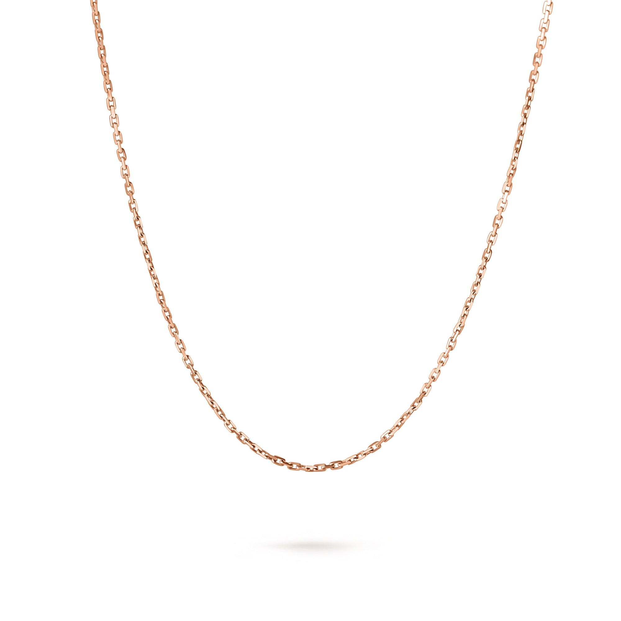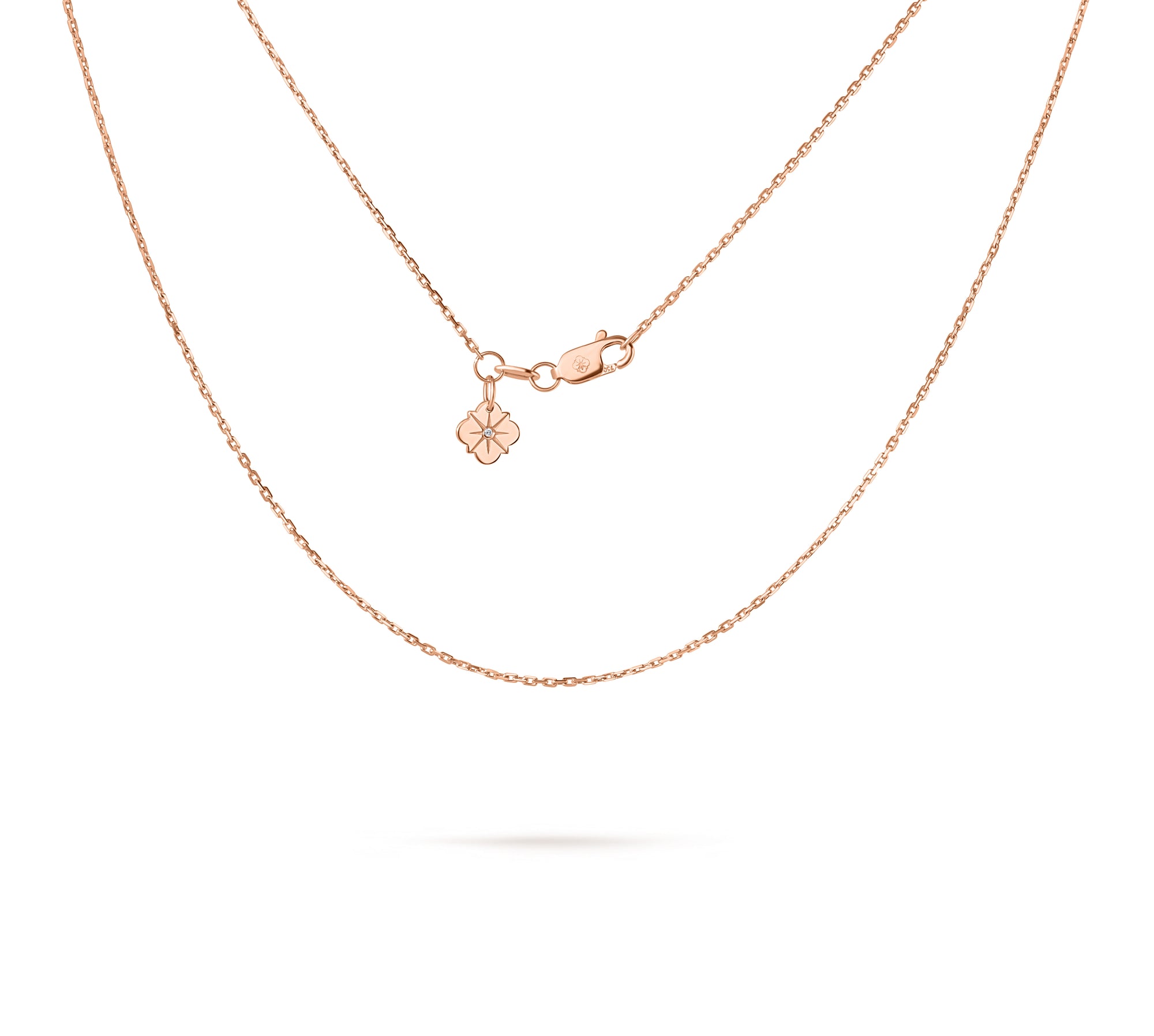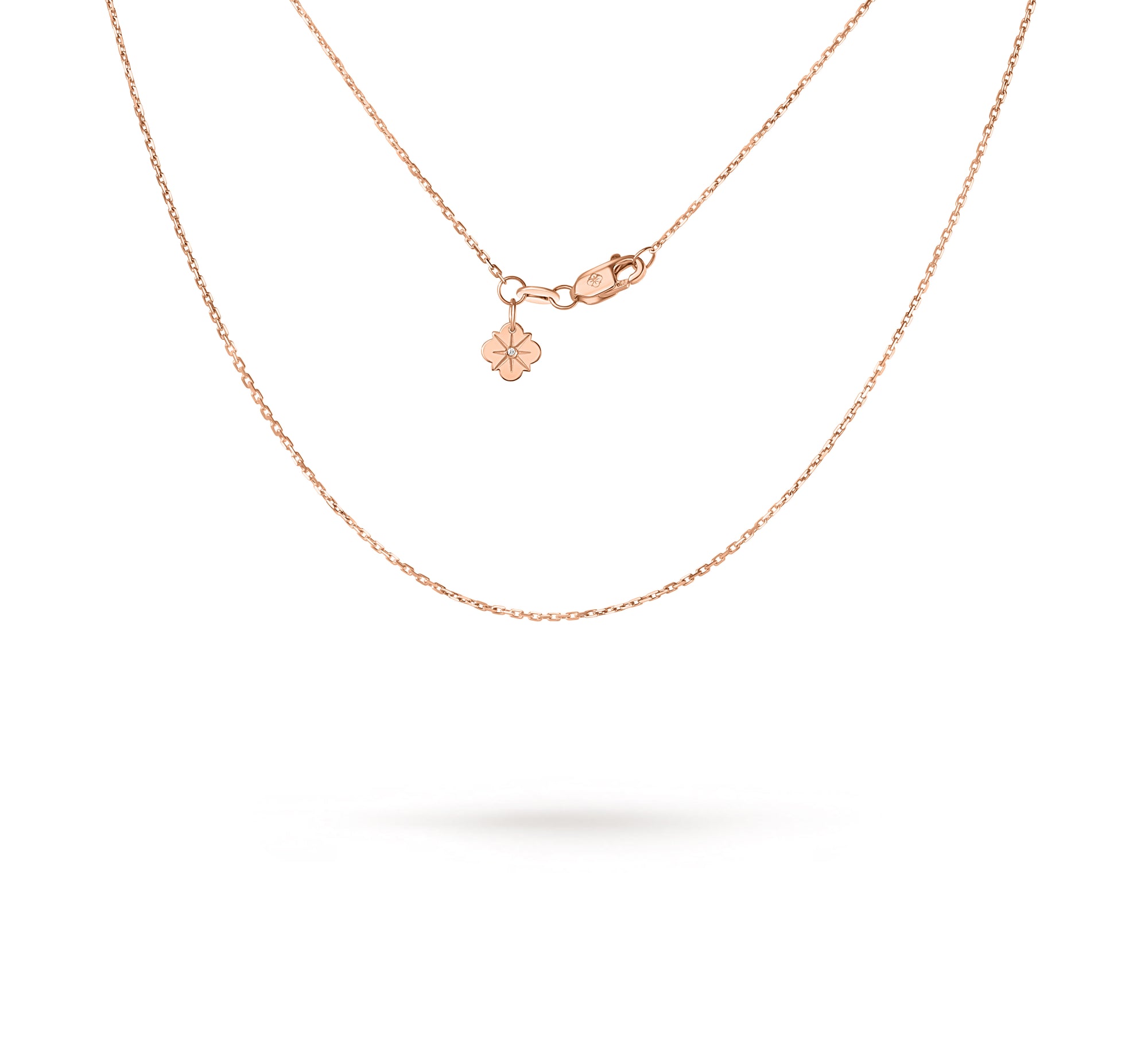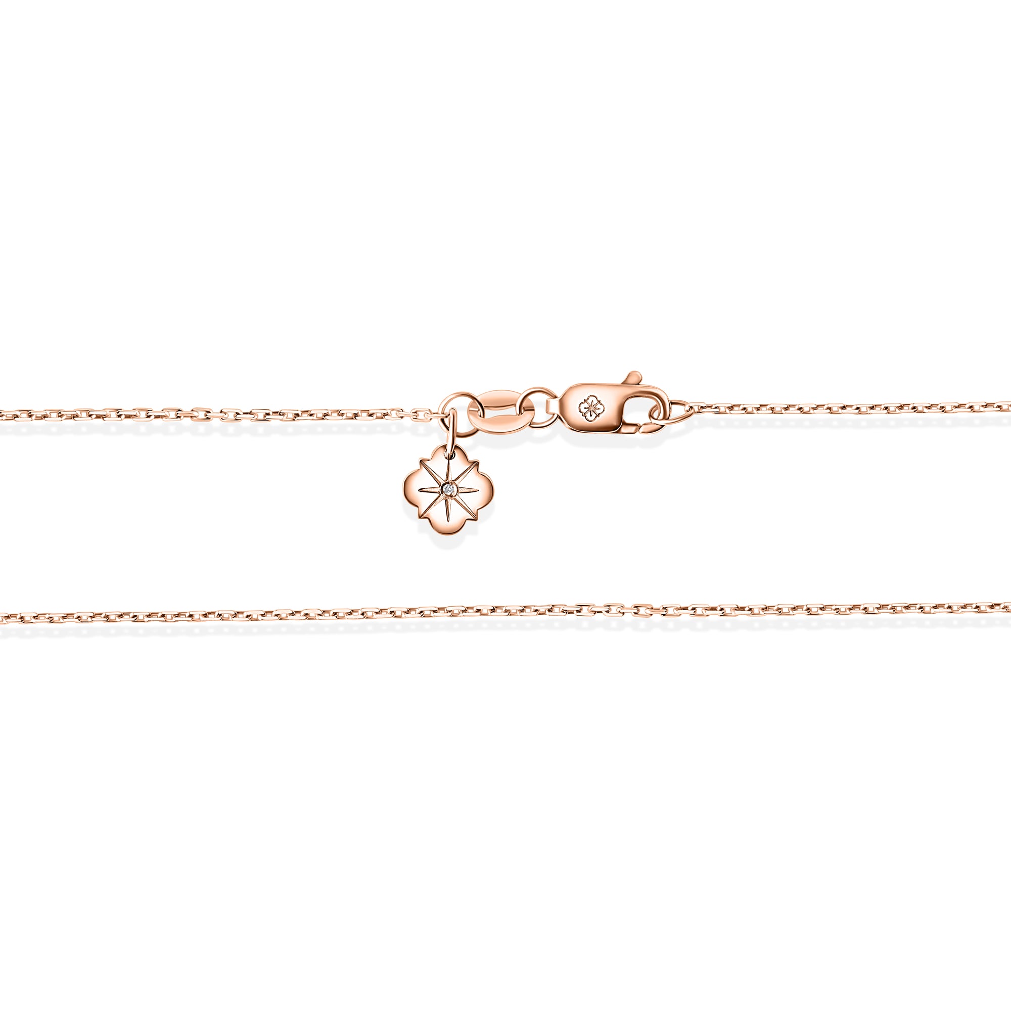 Lanțul Solitaire Signature este lucrat în aur roz de 18K, cu lungime ajustabilă 40/45 cm, cu tag personalizat cu diamant de 0.003 carate.