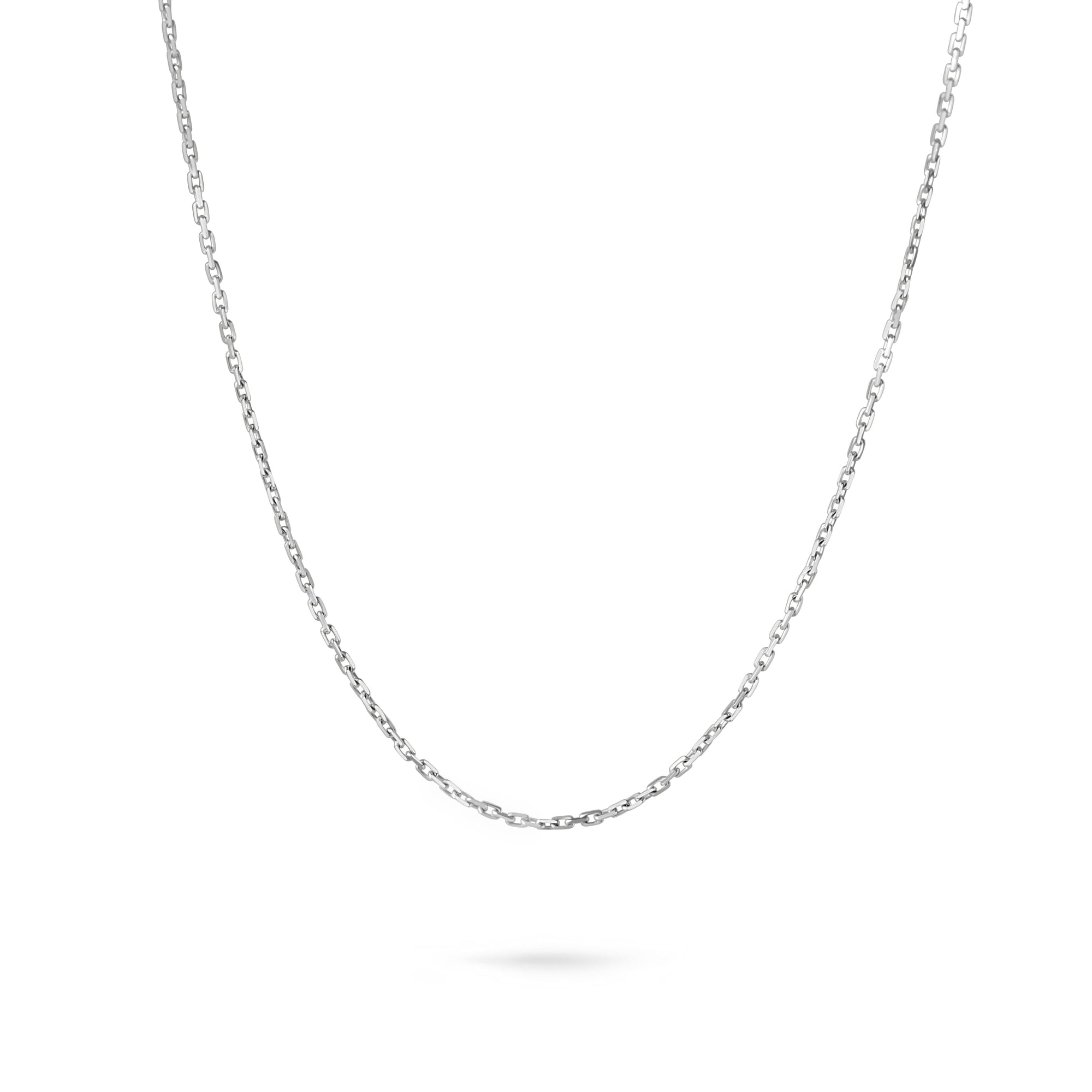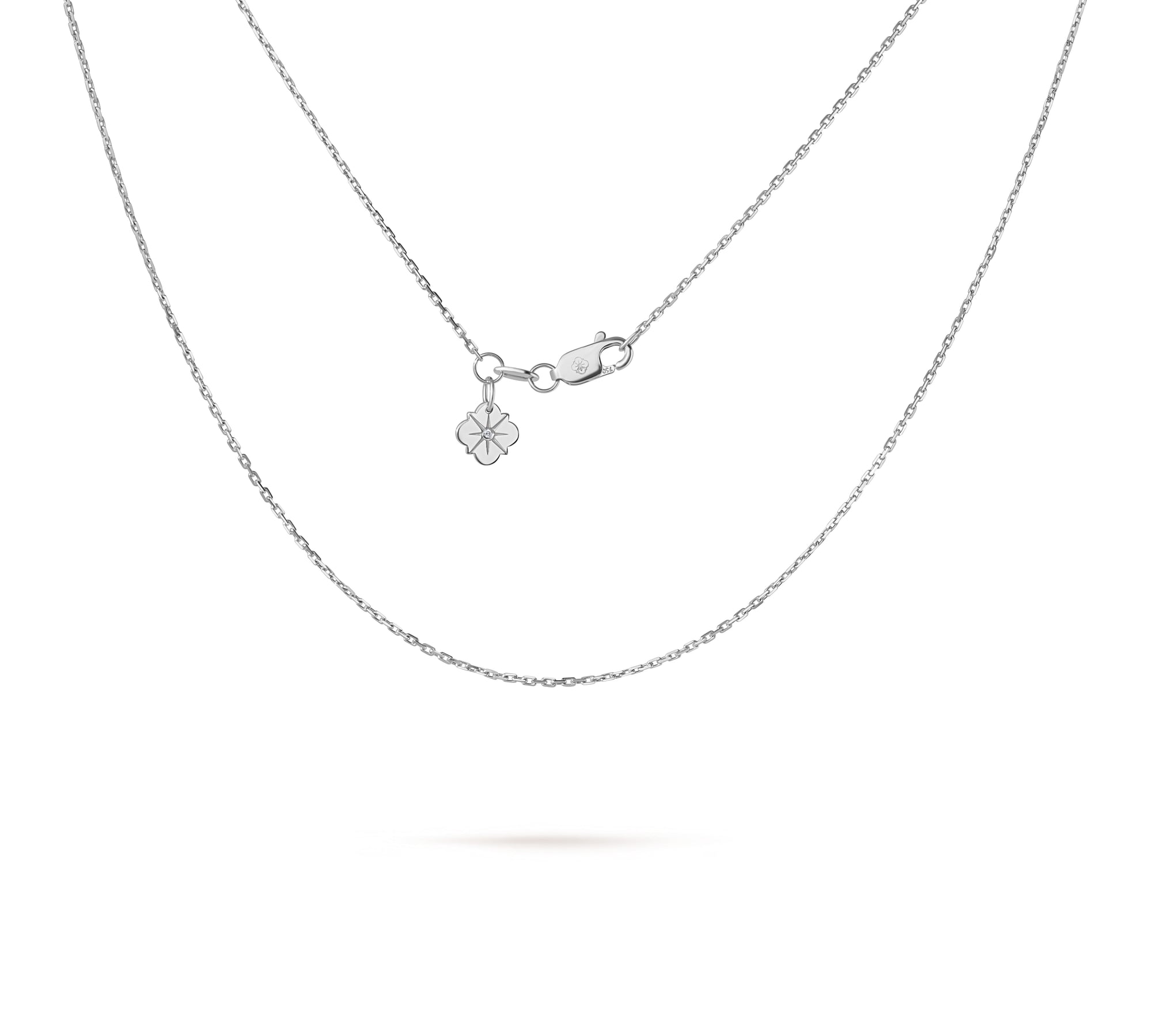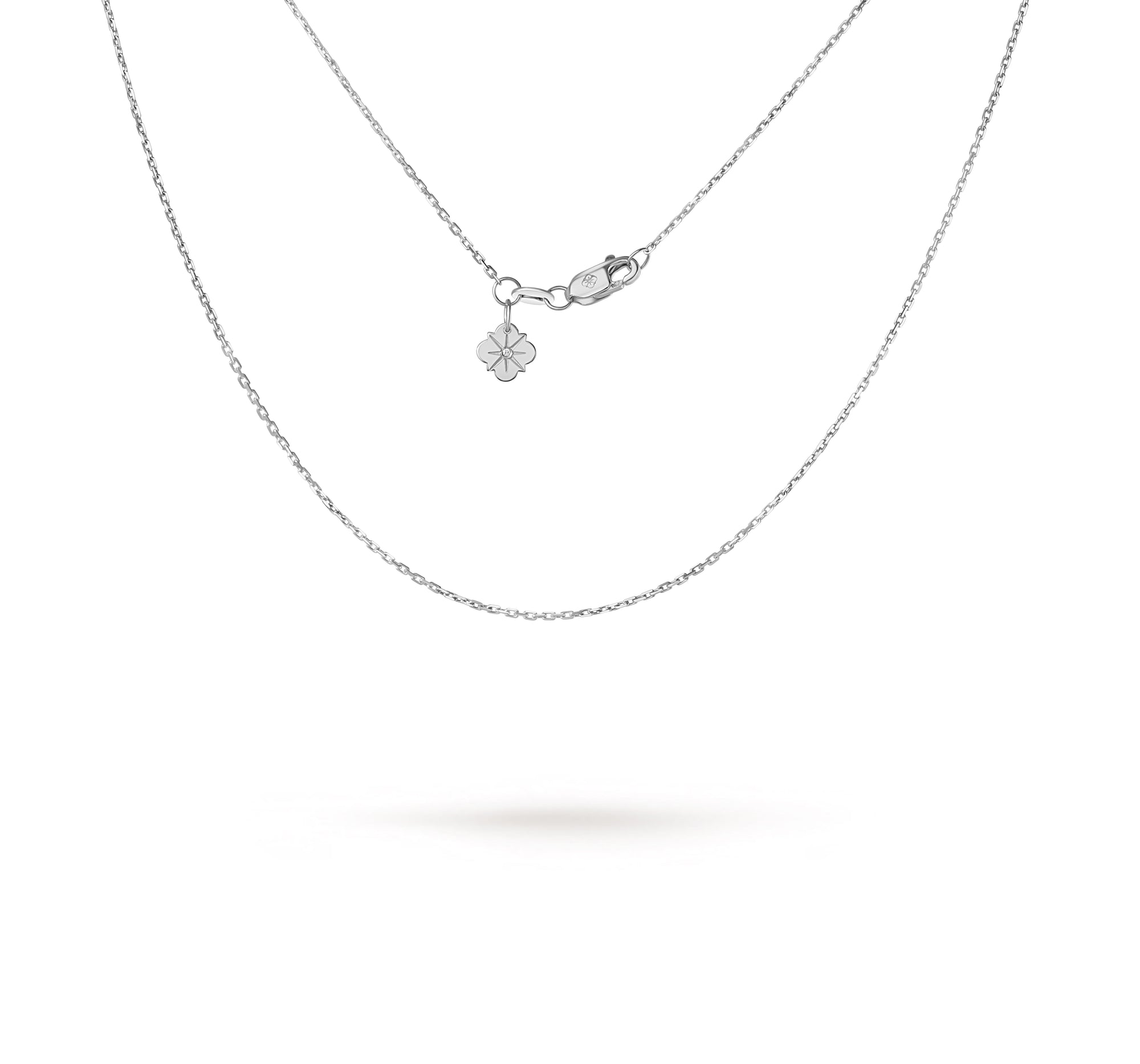 Lanțul Solitaire Signature este lucrat în aur alb de 18K, cu lungime ajustabilă 40/45 cm, cu tag personalizat cu diamant de 0.003 carate.